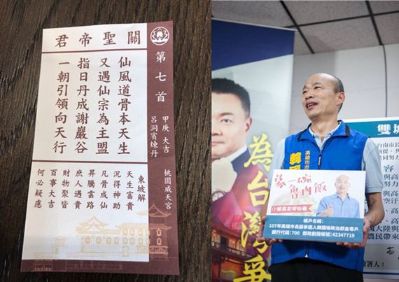 韓國瑜(右)和關圣帝君簽詩。(圖片來源:臺灣“東森新聞云”)