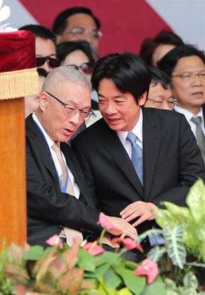 吳敦義、賴清德交頭接耳,互動(dòng)熱絡(luò)。(臺(tái)媒圖)