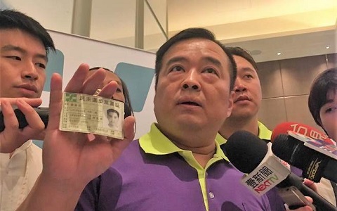 臺北市家長會長團(tuán)體聯(lián)盟總會長謝俊洲昨天拿著黨證嗆民進(jìn)黨“當(dāng)人民是狗嗎” (圖片來自臺媒)