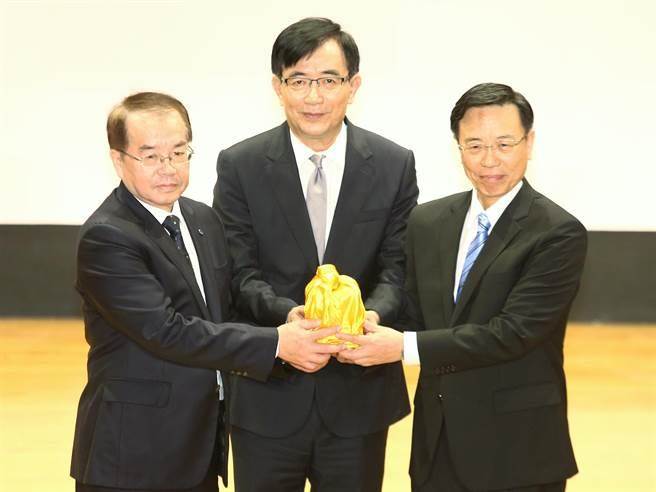臺鐵局9日舉行局長交接典禮,卸任局長鹿?jié)嵣恚ㄗ笃穑┰谂_當(dāng)局“交通部長”吳宏謀的監(jiān)交下,將局長印信交予新任局長張政源。(圖片來源:臺灣“中時電子報”)