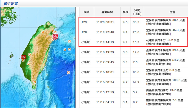 東部海域10小時連3地震,規(guī)模分別是4.9級、4.4級、4.6級。(圖片取自臺媒)