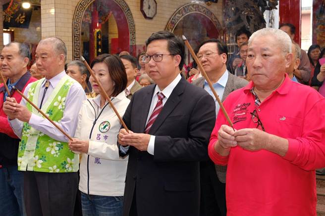 桃園市長(zhǎng)鄭文燦(前排右二)26日在八德指玄宮祈福謝票。(圖片來(lái)源:臺(tái)灣“中時(shí)電子報(bào)”)
