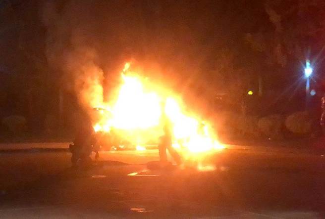 孫中山紀念館停車場一輛汽車燃燒,火勢猛烈。(圖片來源:臺灣“中時電子報”)