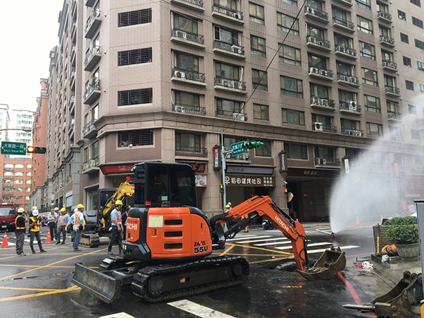 桃園市桃園區(qū)大業(yè)路一段、春日路巷口今天中午污水下水道施工廠商開挖時(shí)不慎挖破瓦斯管,造成瓦斯外泄,警察及消防緊急封路并灑水警戒。(圖片來源:臺(tái)灣《聯(lián)合報(bào)》)