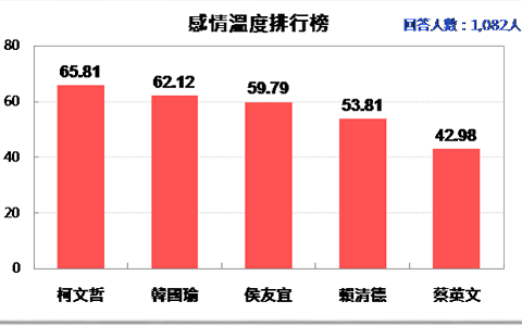 中國(guó)臺(tái)灣網(wǎng)12月24日訊 據(jù)臺(tái)灣《工商時(shí)報(bào)》報(bào)道,親綠的“臺(tái)灣民意基金會(huì)”今天公布臺(tái)灣民眾對(duì)主要政治人物的感情溫度,以臺(tái)北市長(zhǎng)柯文哲的溫度最高、其次是高雄市長(zhǎng)當(dāng)選人韓國(guó)瑜,被列為“反感”的蔡英文則是敬陪末座,意味著已經(jīng)被民意打入冷宮。