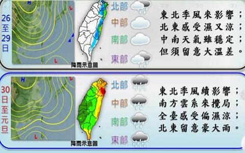 臺灣氣象部門官方臉書表示,26日起下半天將會開始受到東北季風影響,為時整整一周,冷空氣更可能達到冷氣團等級,中部以北低溫最低將下探到13度,南部與花東地區(qū)也不到20度。30日起除了原本的東北季風,南方云系也會前來攪局,全臺都處于濕冷狀態(tài),北部東部地區(qū)會持續(xù)降雨,甚至出現(xiàn)局部性大雨,中南部也有短暫陣雨,整個跨年連假將與雨水度過。
