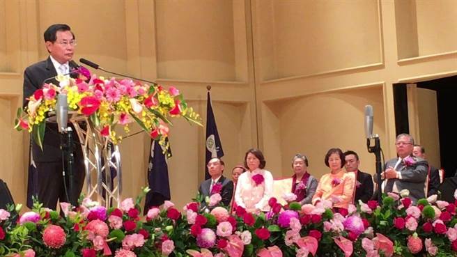 嘉義市卸任市長涂醒哲(左)致詞酸言酸語,新科市長黃敏惠(右中白衣女子)及觀禮者淡定。(圖片來源:臺灣“中時電子報”)