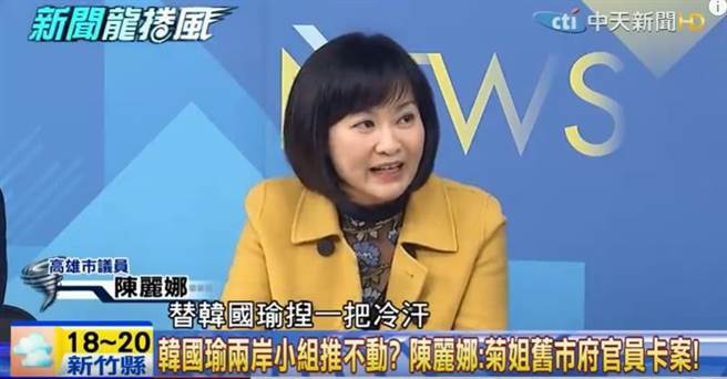 高雄議員陳麗娜昨晚透露,高雄市政府內(nèi)部充斥著陳菊時代舊官員,他們近期多次“卡韓”。(圖片來源:臺灣“東森新聞云”)
