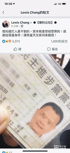 但張某卻于26日晚間在臉譜網(wǎng)(facebook)社團(tuán)“爆料公社”發(fā)文,稱“我知道打人就是不對,我原本是想殺警察的,感謝這張護(hù)身符,讓我當(dāng)天交;丶宜X”,并附上他的民進(jìn)黨證照片,公開向警方嗆聲。警方認(rèn)為張某已另涉嫌“恐嚇公眾罪”,將傳喚張某到案后送辦。