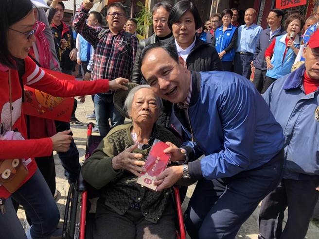 朱立倫2日到新竹市關帝廟上香祈福,并向民眾拜年同時發(fā)放紅包,現(xiàn)場數(shù)千支持民眾擠爆周遭道路。(圖片來源:臺灣“中時電子報”)