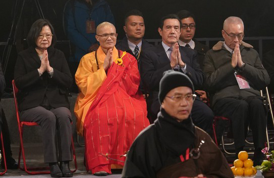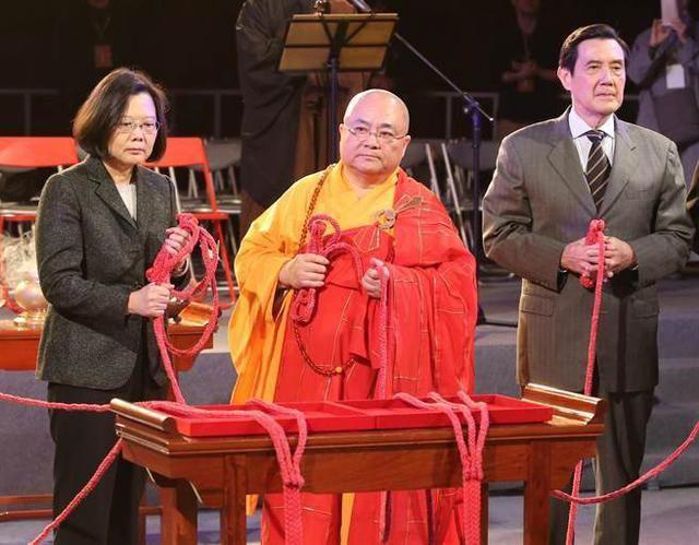 法鼓山除夕敲鐘,蔡英文、馬英九、吳敦義同框祈福無交集。(圖片來源:臺(tái)灣“東森新聞云”)
