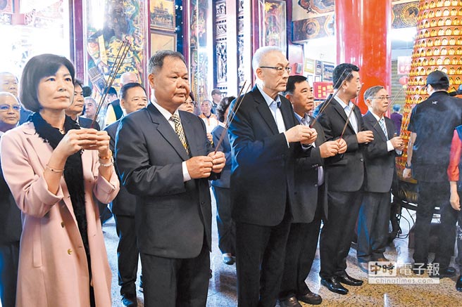 國民黨主席吳敦義(左三)大年初三在家鄉(xiāng)南投縣草屯鎮(zhèn)敦和宮上香,并談及黨內(nèi)初選機(jī)制。(圖片來源:臺灣”中時電子報“)