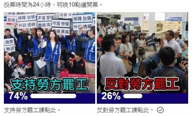 臉譜網(wǎng)不公開社團發(fā)起社員投票,支持臺灣華航罷工占絕大多數(shù)。(圖片來源:臺灣“中時電子報”)