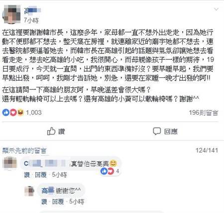 然而,近日來,韓國瑜在高雄引起的話題與氣氛卻讓她媽媽想去看看走走,想去吃高雄的小吃,“母親像孩子一樣的期待,19日要成行,今天就一直問,出門的東西準(zhǔn)備好沒?要早睡早起,我們要早點(diǎn)出發(fā)”。該網(wǎng)友也向高雄網(wǎng)友問及,早晚溫差會(huì)不會(huì)很大、輕軌輪椅可否上去、高雄的小黃能不能載輪椅等問題。