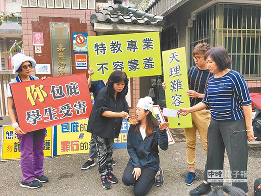 “人本教育基金會(huì)”模擬特殊教育老師逼學(xué)生吃朝天椒的不當(dāng)管教,要求解聘嘉義特教暴力老師。(圖片來(lái)源:臺(tái)灣“中時(shí)電子報(bào)”)