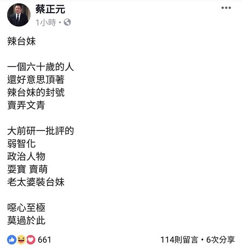 蔡正元近來(lái)頻頻發(fā)文,今日在臉書(shū)表示:“辣臺(tái)妹,一個(gè)六十歲的人,還好意思頂著,辣臺(tái)妹的封號(hào),賣(mài)弄文青。大前研一批評(píng)的,弱智化,政治人物。耍寶、賣(mài)萌,老太婆裝臺(tái)妹,惡心至極,莫過(guò)于此!