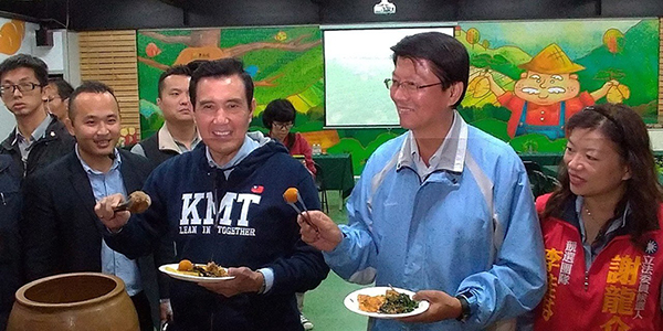 臺(tái)南市“立委”候選人謝龍介今日(11日)與馬英九一起參訪瓜瓜園,品嘗地瓜料理。(圖片來(lái)源:臺(tái)灣《聯(lián)合報(bào)》)
