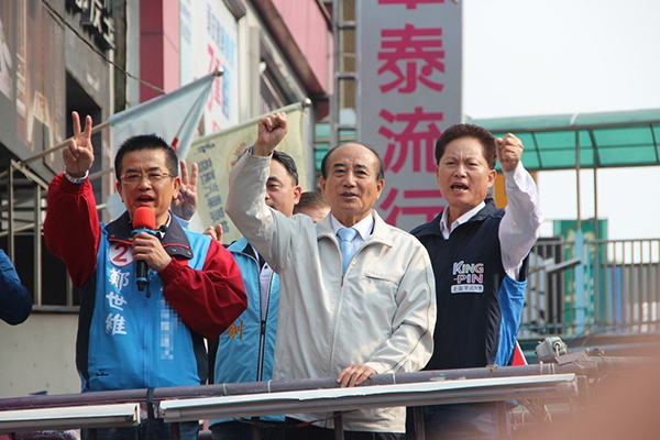 臺當局前“立法院長”王金平(中)今日率“王金平之友會”民眾到國民黨新北市三重“立委”補選候選人鄭世維競選總部,為鄭世維造勢!巴踅鹌街褧毙卤笨倳倳L、前“立委”盧嘉辰(右)也出席。(圖片來源:臺灣《聯(lián)合報》)