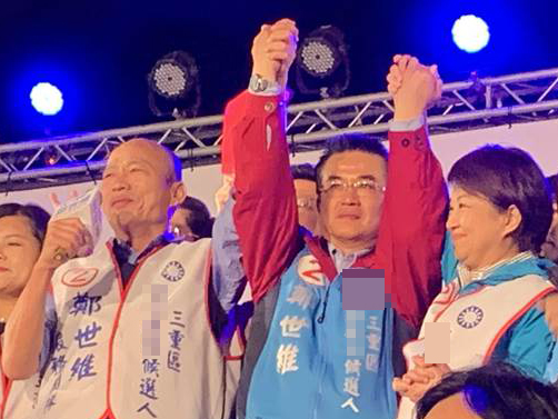 韓國(guó)瑜(左)盧秀燕(右)緊握鄭世維手,高呼加油。(圖片來(lái)源:臺(tái)灣“中時(shí)電子報(bào)”)