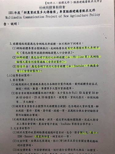 根據(jù)報(bào)告內(nèi)容,該案原本是“媒體輿情觀測(cè)服務(wù)”,廠商要進(jìn)行輿情分析、議題聲量及趨勢(shì)分析,并替“農(nóng)委會(huì)”制作倡導(dǎo)素材,不過(guò)去年追加190萬(wàn)經(jīng)費(fèi)后,工作內(nèi)容變本加厲,要廠商在各大媒體平臺(tái)如臉譜網(wǎng)、YouTube、LINE進(jìn)行“倡導(dǎo)”,且得標(biāo)廠商還是“進(jìn)駐”“農(nóng)委會(huì)”上班。