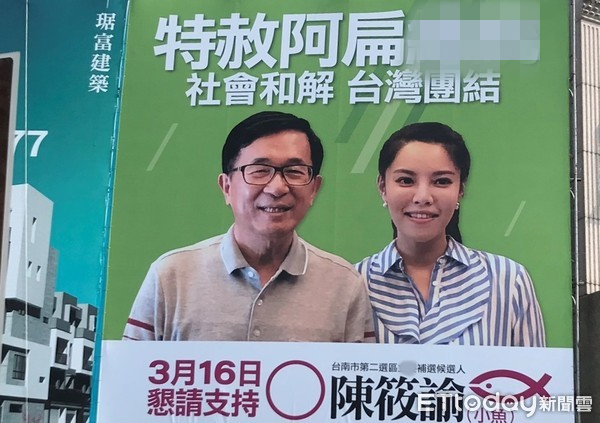 陳筱諭競選期間主張“特赦”陳水扁,還掛出合影招牌爭取支持者。(圖片來源:臺(tái)灣“東森新聞云”)