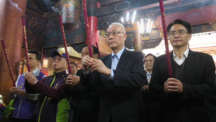 國民黨主席吳敦義1日上午到鹿港護安宮與媽祖玻璃廟臺灣護圣宮兩地參拜(圖片來源:臺灣“中時電子報”)