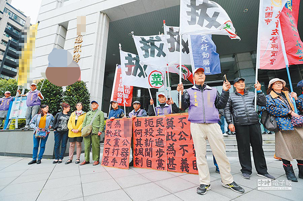 藍(lán)天行動聯(lián)盟、桃園市基層佐警聯(lián)誼會等團(tuán)體1日前往“NCC”,力挺“中天新聞臺”,控訴“NCC”對中天裁罰是箝制新聞自由。(圖片來源:臺灣“中時電子報”)