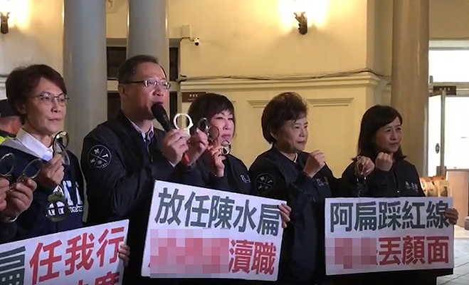 陳水扁“趴趴走”,國民黨團怒帶手銬檢舉臺“法務(wù)部”瀆職。(圖片來源:臺灣《聯(lián)合報》)
