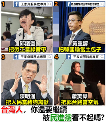 蔡當(dāng)局執(zhí)政后不僅推出的政策不得民心,許多官員的言論也經(jīng)常引發(fā)爭議。對此,“鳳凰花護(hù)民主市政監(jiān)督聯(lián)盟”PO文指出,綠營“立委”邱議瑩,把勞工當(dāng)“錄音帶”;蔡英文辦公室發(fā)言人黃重諺,把高雄市長韓國瑜當(dāng)“土包子”;臺陸委會主委陳明通把人民當(dāng)“豬狗禽獸”;民進(jìn)黨“立委”蕭美琴,把鴻海集團(tuán)總裁郭臺銘當(dāng)“空氣”。該粉專直言“臺灣人,你還要繼續(xù)被民進(jìn)黨看不起嗎?”(中國臺灣網(wǎng) 劉洪羊)