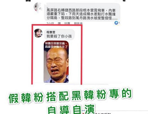 游淑慧說,看到臉譜網(wǎng)名為“程惠雯”的賬號(hào)到處留言酸高雄市長(zhǎng)韓國(guó)瑜,到底是假韓粉、搭配“黑韓粉專”自導(dǎo)自演,還是單純不理性反韓者的暴力留言?大家來公斷。