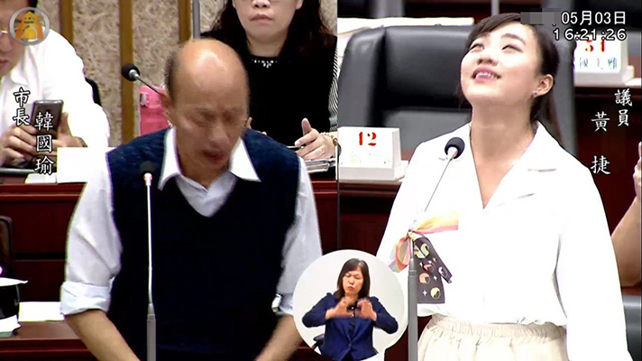 “時(shí)代力量”高雄市議員黃捷(右)3日質(zhì)詢市長(zhǎng)韓國(guó)瑜有關(guān)自由經(jīng)濟(jì)貿(mào)易區(qū)時(shí),因韓國(guó)瑜回答“高雄要發(fā)大財(cái)”而驚呼仰頭翻白眼。(圖片取自臺(tái)媒)