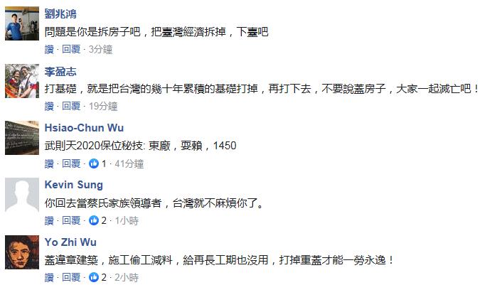 不過(guò)臺(tái)灣網(wǎng)友對(duì)此并不買賬。有網(wǎng)友表示,蔡英文根本沒(méi)在蓋房子,而是在拆房子,把臺(tái)灣的經(jīng)濟(jì)基礎(chǔ)都拆掉;也有網(wǎng)友批評(píng),蔡蓋違章建筑,施工偷工減料,給再長(zhǎng)工期也沒(méi)用,打掉重蓋才能一勞永逸。ㄖ袊(guó)臺(tái)灣網(wǎng) 高旭)