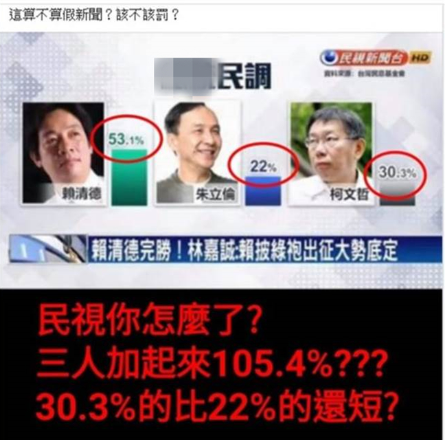 親綠智庫“臺灣民意基金會”發(fā)布所謂的最新民調(diào),稱若韓國瑜、蔡英文對決,韓以40.8%輸給蔡的47.1%;若韓國瑜、賴清德對決,韓支持度為38.5%,大幅落后賴的53.0%。不過有粉絲頁卻發(fā)現(xiàn)賴清德、朱立倫、柯文哲3人競爭的情況下,賴53.1%、朱22%、柯30.3%,3人的民調(diào)加起來居然是105.4%,另外民調(diào)長條圖30.3%居然還比22%還短。