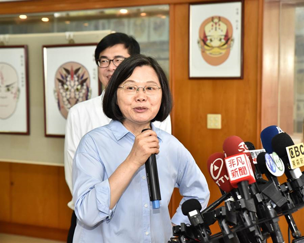 蔡英文19日到高雄市內(nèi)門南海紫竹寺參拜,會后接受媒體訪問。(圖片來源:臺灣“中時電子報”)