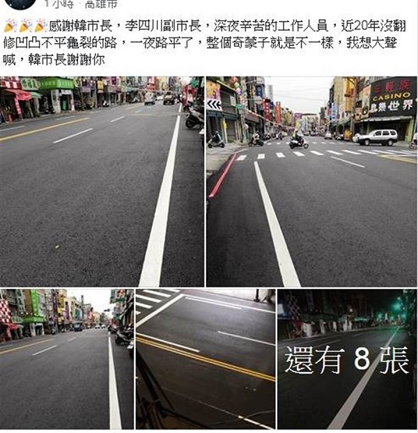 一位網(wǎng)友在“韓國瑜后援會”PO出多張鳳山區(qū)五甲道路照片,感謝辛苦的工作人員,讓凹凸不平龜裂的路,一夜路平了。(圖片來自臺媒)