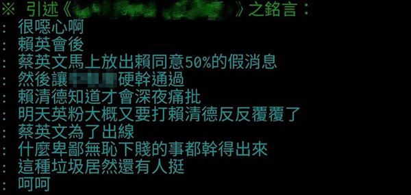 有網(wǎng)友也在PTT論壇直言:“很惡心啊,‘賴英會(huì)’后,蔡英文馬上放出賴同意50%的假消息,然后讓‘中執(zhí)會(huì)’硬干通過,賴清德知道才會(huì)深夜痛批。明天‘英粉’大概又要打賴清德反反復(fù)覆了。蔡英文為了出線,什么卑鄙無恥下賤的事都干得出來,這種垃圾居然還有人挺,呵呵!