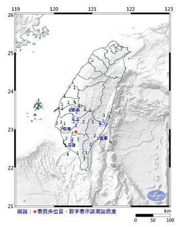 臺(tái)當(dāng)局“中央氣象局”表示,高雄市美濃區(qū)晚間11點(diǎn)53分發(fā)生規(guī)模4.6級(jí)地震,深度12.8公里,震中位在高雄市府東北方43.4公里,震度最大4級(jí)在旗山。其余各地震度分別為屏東縣三地門3級(jí),臺(tái)南市、屏東市、嘉義縣大埔、臺(tái)東縣、花蓮縣富里2級(jí),連遠(yuǎn)在彰化及南投縣也有1級(jí)。