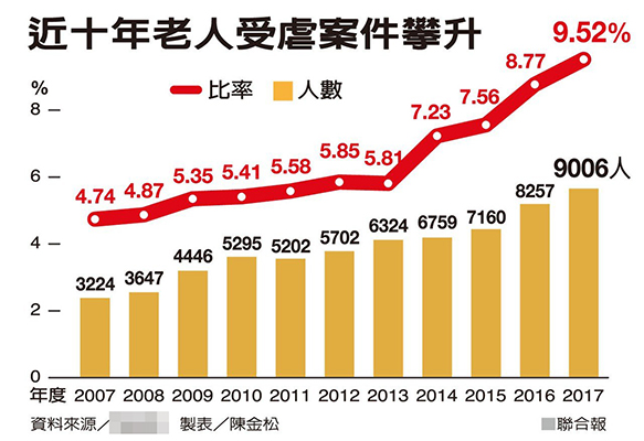 臺灣2007-2017老人受虐案不斷攀升。(圖片來源:臺灣《聯(lián)合報》)