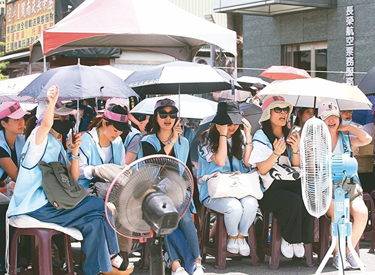 臺(tái)灣長榮空乘人員昨第二天罷工,空乘人員頂著大太陽,持續(xù)在長榮南崁航運(yùn)大樓前靜坐抗議,為避免中暑,一旁架設(shè)電風(fēng)扇降溫。(圖片來源:臺(tái)灣《聯(lián)合報(bào)》)
