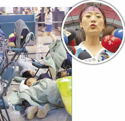 長榮空服員罷工第3天遇上周末,桃園機(jī)場內(nèi)2名排隊等候的旅客累得席地而睡。(圖片來源:臺灣“中時電子報”)