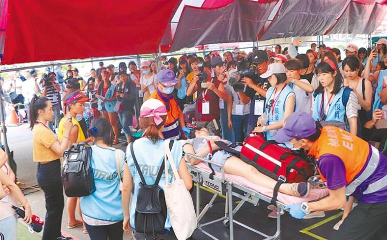 長(zhǎng)榮罷工現(xiàn)場(chǎng)一名空服員身體不適昏倒(圖片來(lái)源:臺(tái)灣《中國(guó)時(shí)報(bào)》)
