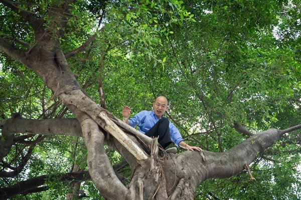 高雄市長韓國瑜日前為了視察噴藥防疫工作,攀上近2層樓高的大樹,查看樹洞積水狀況,遭外界批評作秀。(圖片來源:臺灣“中時電子報”)