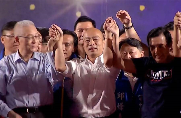國民黨2020臺灣地區(qū)領(lǐng)導(dǎo)選舉參選人韓國瑜8日舉行造勢大會,前臺灣地區(qū)領(lǐng)導(dǎo)人馬英九到場站臺助講。(圖片來源:臺灣“中時電子報”)