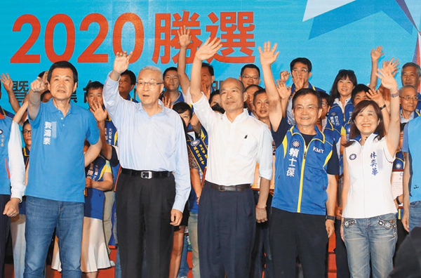 吳敦義(前左二)和韓國瑜(前右三)10日一同出席國民黨市黨部舉辦的“中國國民黨2020勝選暨臺北市里長服務(wù)促進(jìn)會授證典禮”,和國民黨臺北市黨籍“立委”參選人一同高呼口號,沖刺選情展現(xiàn)勝選的決心。(圖片來源:臺灣《中國時報》)