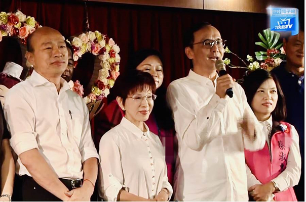 國民黨2020大選提名人韓國瑜今(22日)中午為國民黨前主席、國民黨臺南市第六選區(qū)"立委"參選人洪秀柱站臺,與前新北市長朱立倫一起同臺。(圖片來源:臺灣“中時電子報(bào)”)