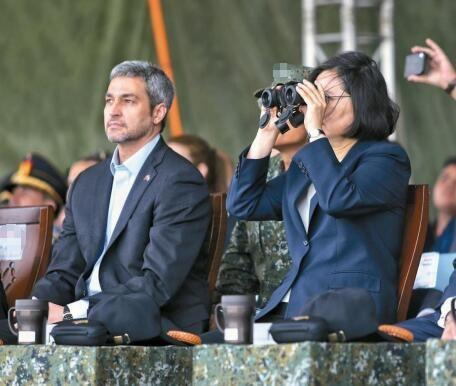 2018年,蔡英文與巴拉圭總統(tǒng)貝尼特斯(左)觀看臺軍演習。(圖片來源:臺灣《聯(lián)合報》)
