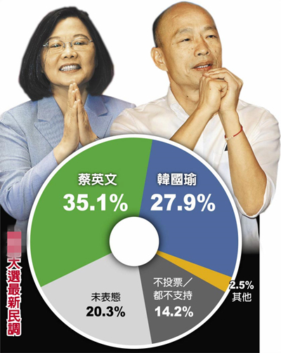 最新民調(diào):韓國(guó)瑜民調(diào)觸底反彈 與蔡英文差距縮至7.2%