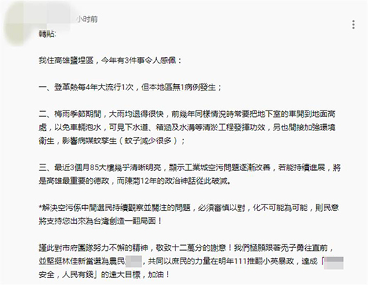 該網(wǎng)友更對(duì)高雄市府表示深深的感謝,對(duì)市府團(tuán)隊(duì)努力不懈的精神敬致十二萬分的謝意!他說,“我們極愿跟著禿子勇往直前,并堅(jiān)挺林佳新當(dāng)選為農(nóng)民‘立委’,共同以庶民的力量在明年111(1月11日)推翻小英暴政,”達(dá)成“臺(tái)灣安全,人民有錢”的遠(yuǎn)大目標(biāo),加油!