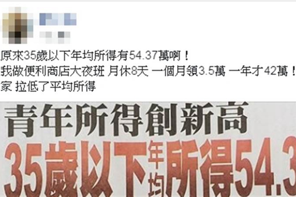 有網(wǎng)友轉(zhuǎn)發(fā)新聞,說(shuō)“原來(lái)35歲以下年均所得有54.37萬(wàn)!我做便利商店大夜班,月休8天,一個(gè)月領(lǐng)3.5萬(wàn),一年才42萬(wàn)!我對(duì)不起大家,拉低了平均所得。”