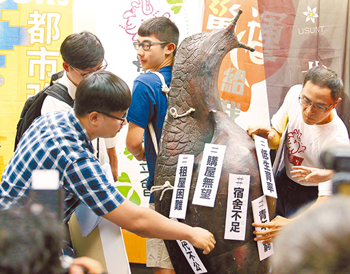 年輕人背負(fù)蝸牛殼,凸顯高房價(jià)壓力。(圖片來源:臺灣“中時(shí)電子報(bào)”)
